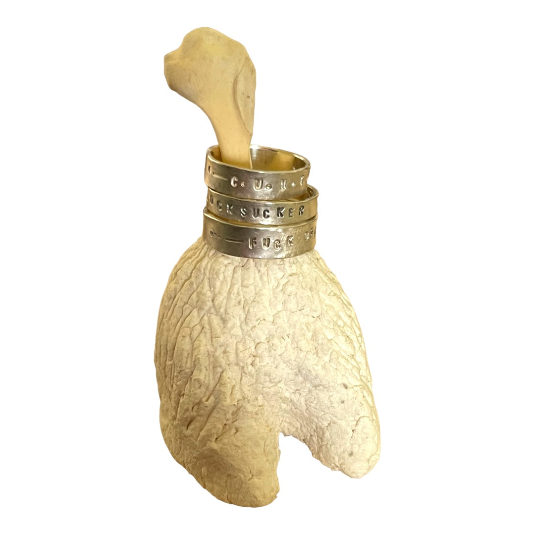 Expertly crafted from high-quality sterling silver, our Cunt Ring features a unique hand-stamped design with a luxurious satin finish. The polished inside offers superior comfort, while the hammered edges add a touch of sparkle with their burnished shine. This stylish 5.5mm wide band is perfect for making a bold statement.