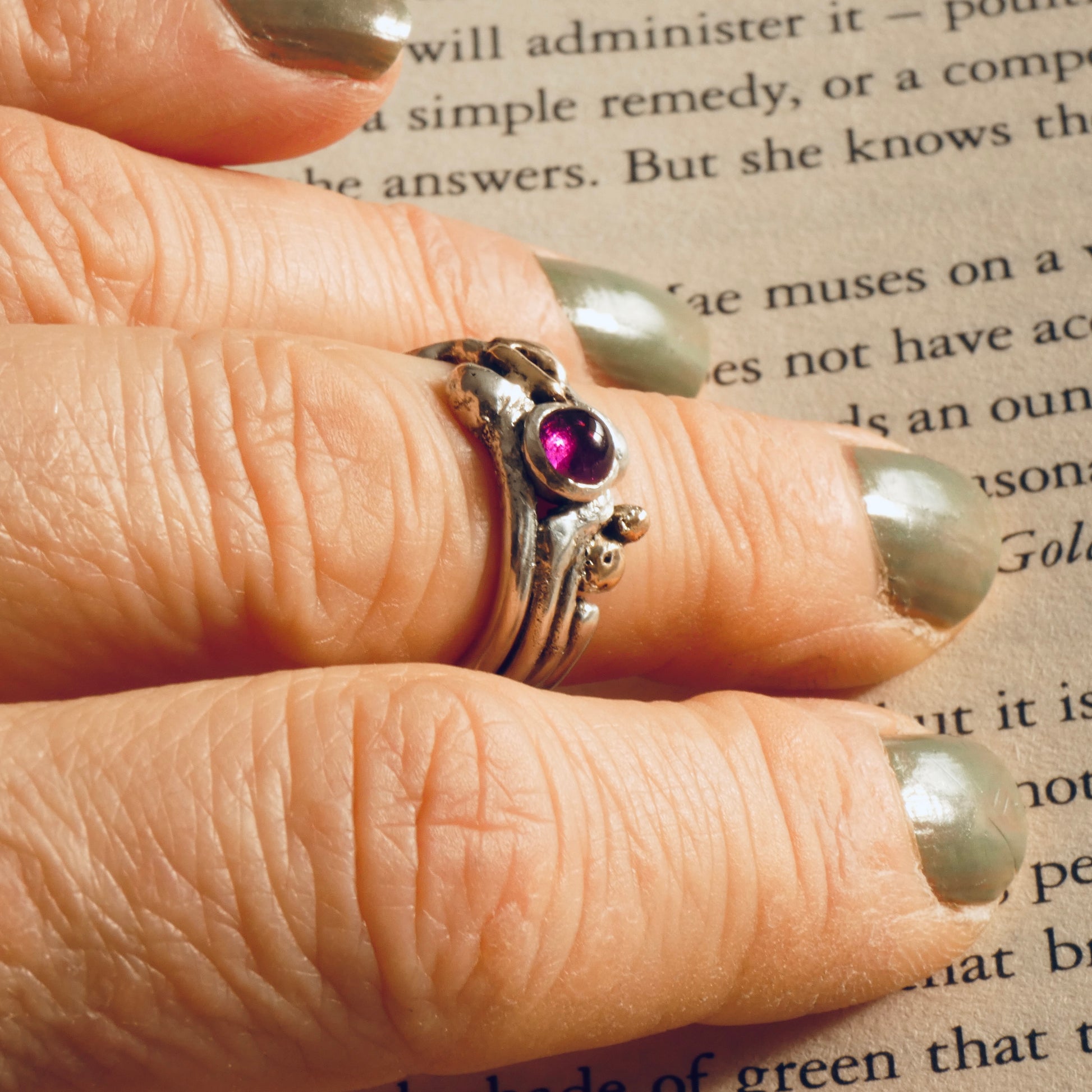 A glowing pink Rhodonite garnet is combined with 9ct yellow gold and silver in this piece. The ring is one from my Galactica collection, so named as I feel they are a little other worldly. The band is formed from four strands of silver that are partially melded together to close the circle. Gold has been fused into the surface to just add a little warmth to the stone.